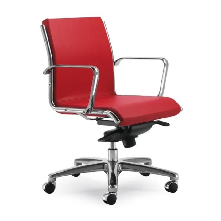 Lo schienale integra una struttura in metallo con imbottitura in poliuretano stampato a freddo, per un sostegno stabile e durevole. Anche il sedile presenta un’anima in metallo, con molleggio a cinghie elastiche e imbottitura in poliuretano stampato a freddo, per una seduta elastica e confortevole nel tempo. I braccioli in alluminio lucido completano il prodotto con un segno elegante e professionale.