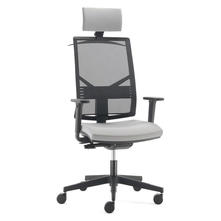 Sedia da ufficio direzionale con base a 5 razze in nylon, ruote piroettanti in nylon o gommate e alzata a gas certificata dal Catas in classe 3, poggiatesta con portagiacca.